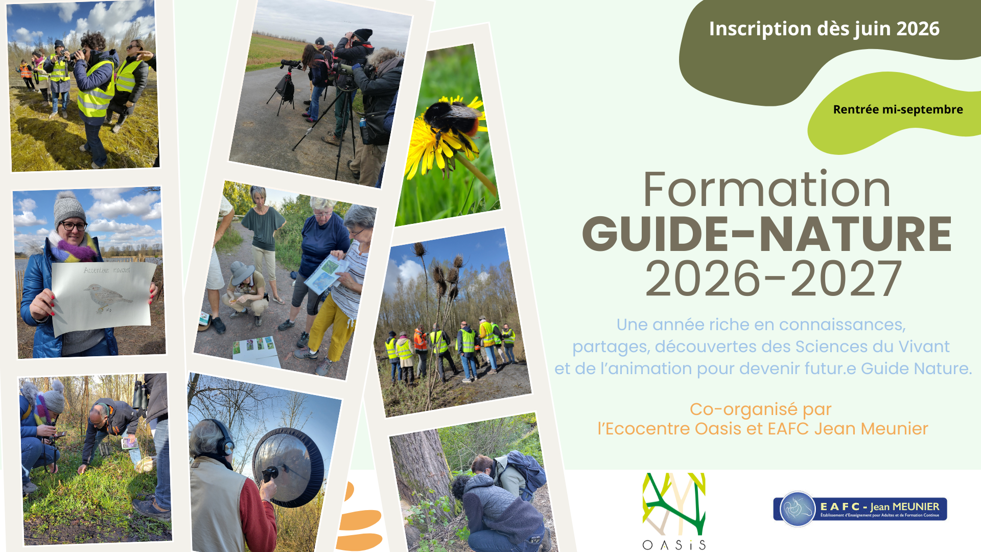 La formation 2026-2027, organisée par l’EAFC Jean Meunier en partenariat avec l’Écocentre Oasis, alterne cours théoriques et sorties de terrain du 16 septembre 2026 au 14 juin 2027, avec un examen de guidance fin août 2027.